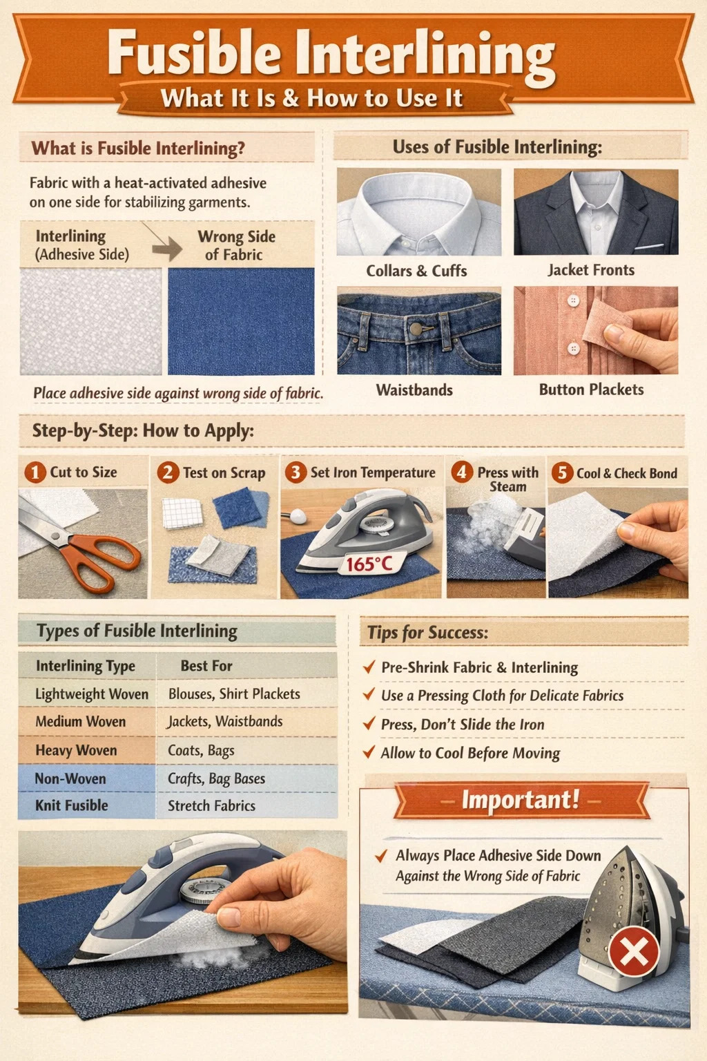 | Тяжелый тканый плавкий материал | Передняя часть пальто, структурированные сумки | Плотная шерсть, холст. | 170–180°С |