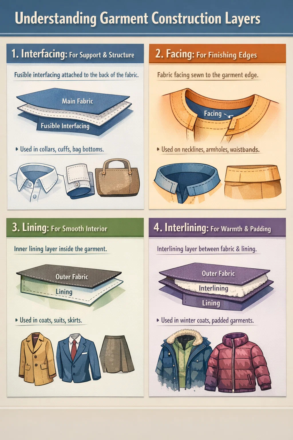 При изготовлении одежды или сумок эти четыре понятия могут показаться немного запутанными, но на самом деле они похожи на различные части стальной арматуры и отделки, используемые при строительстве дома. Чтобы эффективно использовать их, важно понять, какое место каждый из них занимает в общей структуре.