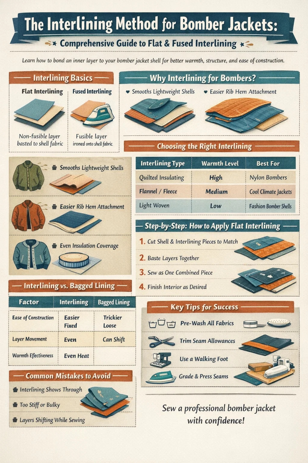 Какой бы материал подкладки вы ни выбрали, метод плоской подкладки превращает процесс изготовления бомбера из утонченной задачи по вставке подкладки в методичную, поэтапную сборку — и это значимое обновление для всех, кто раньше боролся с вклеиванием подкладки в куртку с ребристым краем.