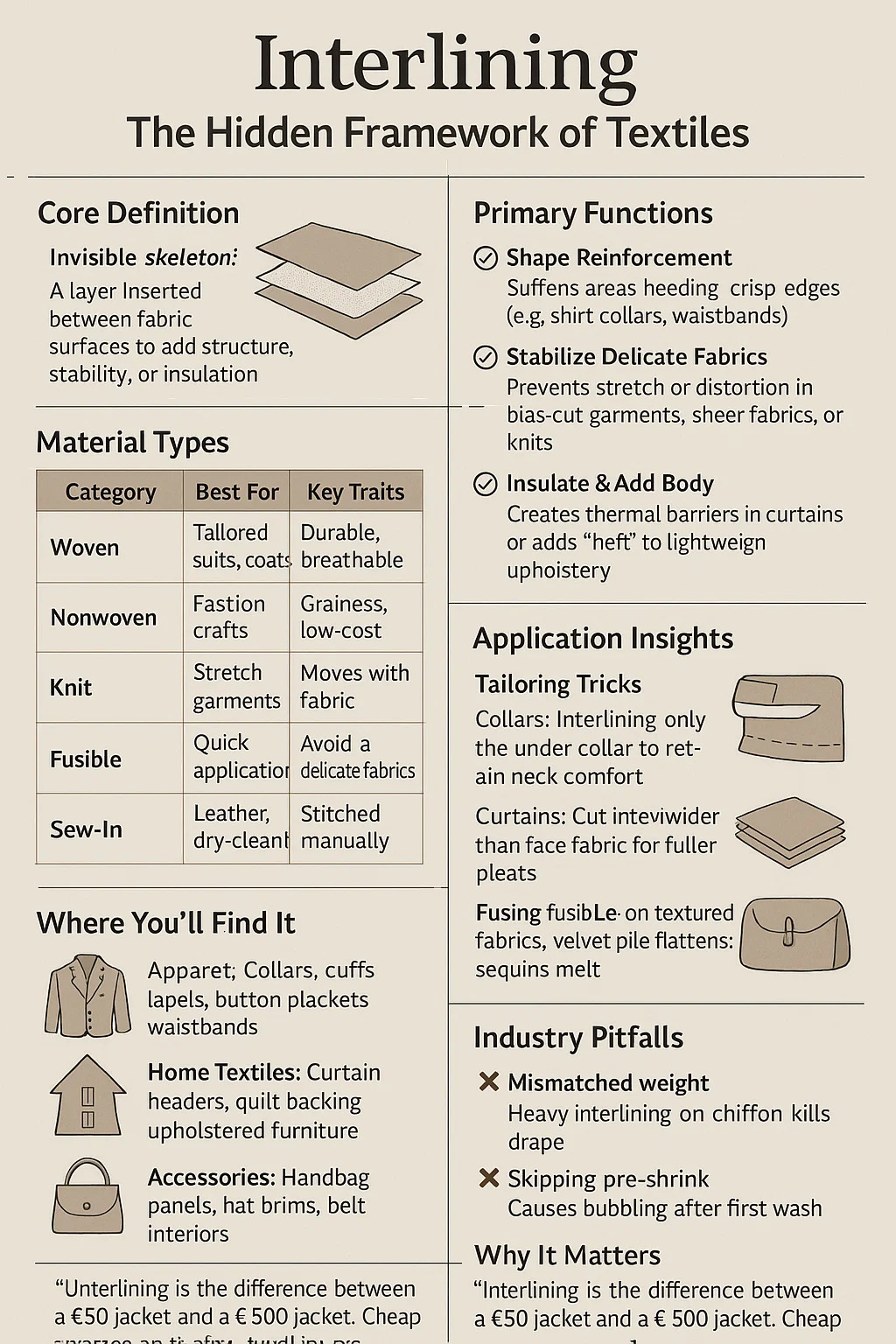 «Невидимый скелет»: слой, вставленный между поверхностями ткани, чтобы добавить структуру, стабильность или изоляцию.