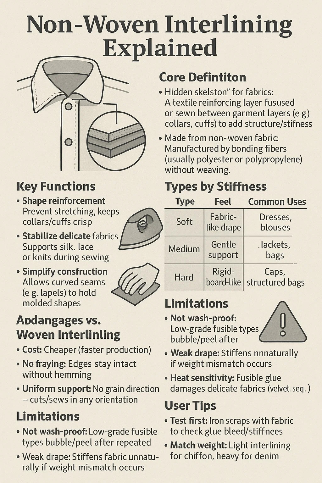 «Скрытый скелет» для тканей: текстильный укрепляющий слой слился или сшит между слоями одежды (например, воротники, манжеты), чтобы добавить структуру/жесткость.